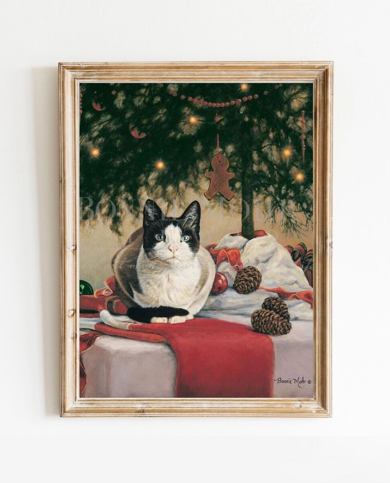 What a great print by artist Bonnie Mohr! The cat, looking expectant, sitting under the Christmas tree surrounded by pinecones and gingerbread men. Is she waiting for Santa Claus? Or are dreams of sugarplums dancing in her head? View additional cat, winter, and Christmas artwork by Bonnie Mohr.