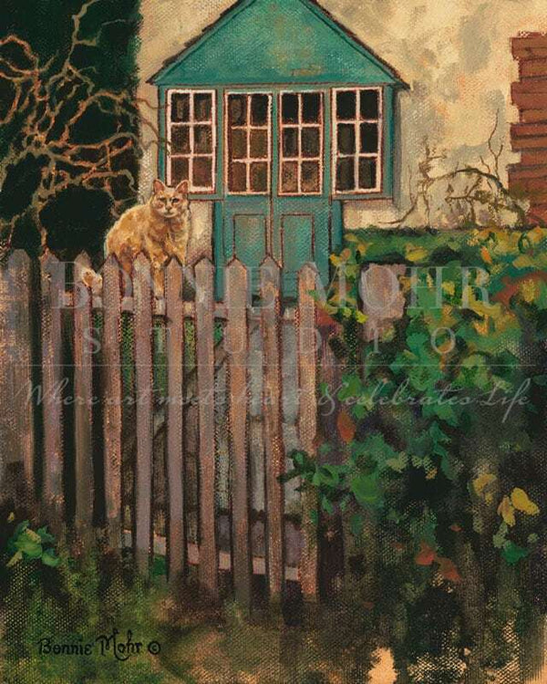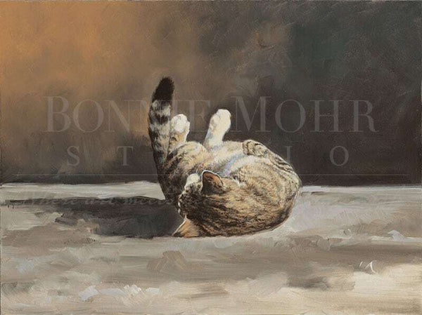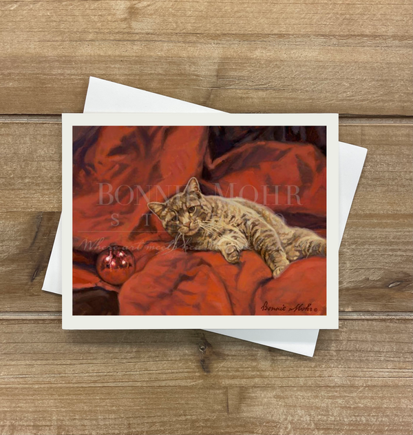 A personal note from Bonnie: What goes through a cat's mind, while they are sitting underneath a Christmas tree?......maybe temptations of climbing the tree.....or playing with the dangling ornaments.......or eating the gingerbread cookie hanging right in front of her! This tabby cat belongs to a friend of mine, who captured this great moment on her camera. I used it for this painting, and used my imagination to develop a curious -unfolding setting around her.