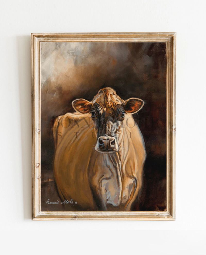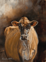 In NEW JERSEY, I was focusing on the pure beauty of this Jersey’s face. I’ve always thought that Jersey cows have such a regal charm. Their beautiful color, big brown eyes, and ‘deer like’ features make them one of the most beautiful animals on earth. Painted in a sun-bathed, dark background, this gorgeous Jersey Cow is the focus, front and center. This is the perfect piece of artwork to celebrate the Jersey cow and will add charm to any room in your office or home.