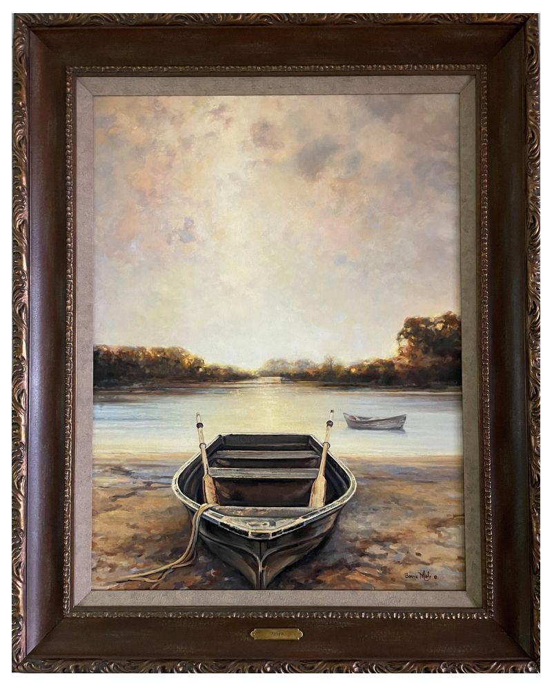 Framed: 41 x 51 with custom wood frame and 23 Karat antiqued gold leaf title plate