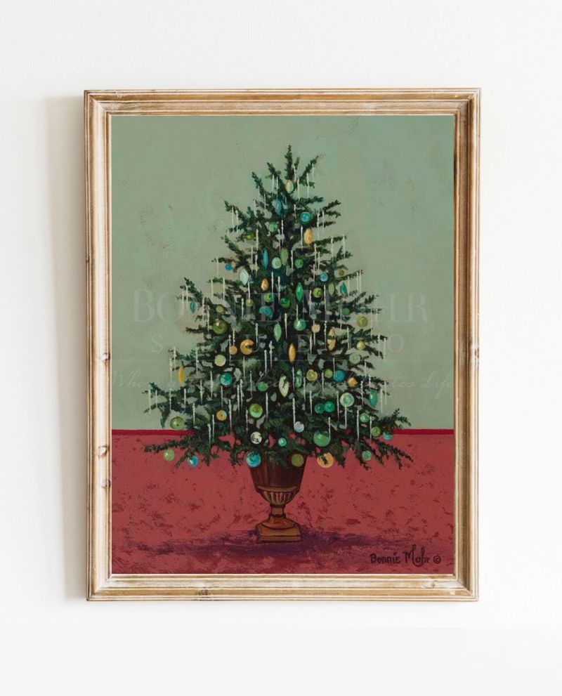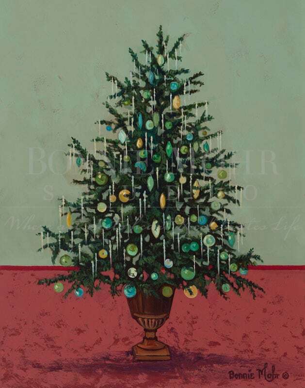 View complimentary prints to this tree series Berry Beads, Red Ribbon and Birds, and Snow White. View additional Christmas and winter artwork by Bonnie Mohr.