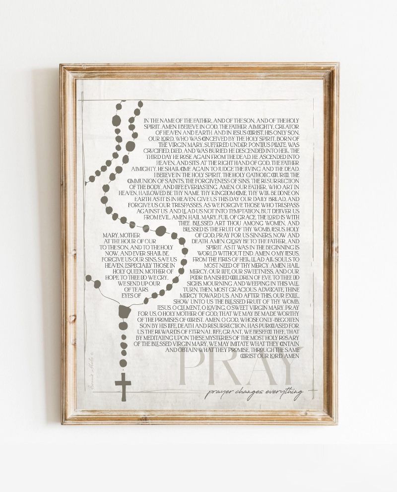 Pray 2 is a modern expression of timeless devotion. I created a loosely sketched, freeform outline of a rosary, and paired it with a traditional, sacred-style font that includes all the words of the rosary prayer. The simplicity of the two-tone design brings a contemporary feel, while still holding deep spiritual meaning. Like my other work, it was inspired by a moment of quiet reflection and a desire to share the peace and strength that comes from prayer.