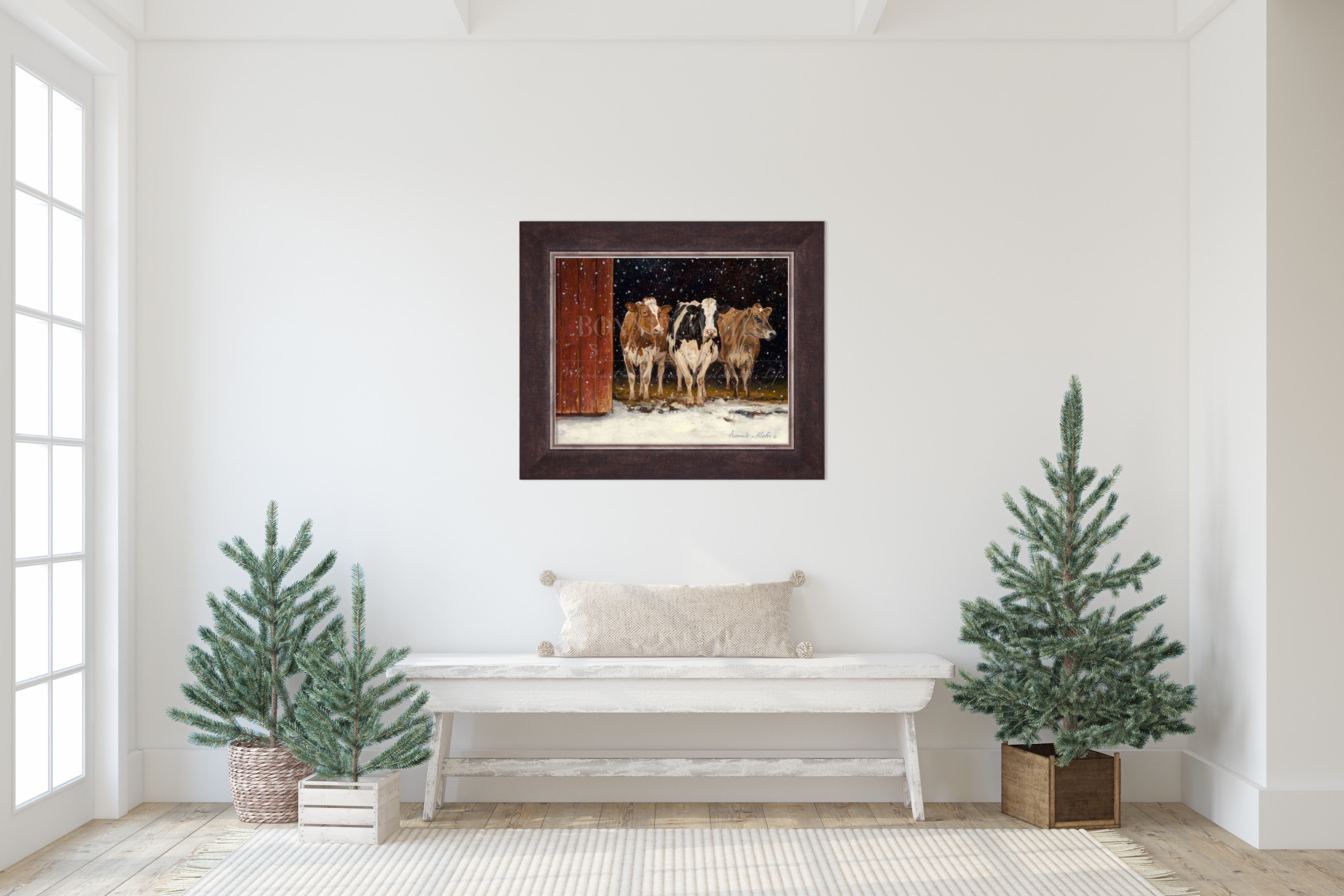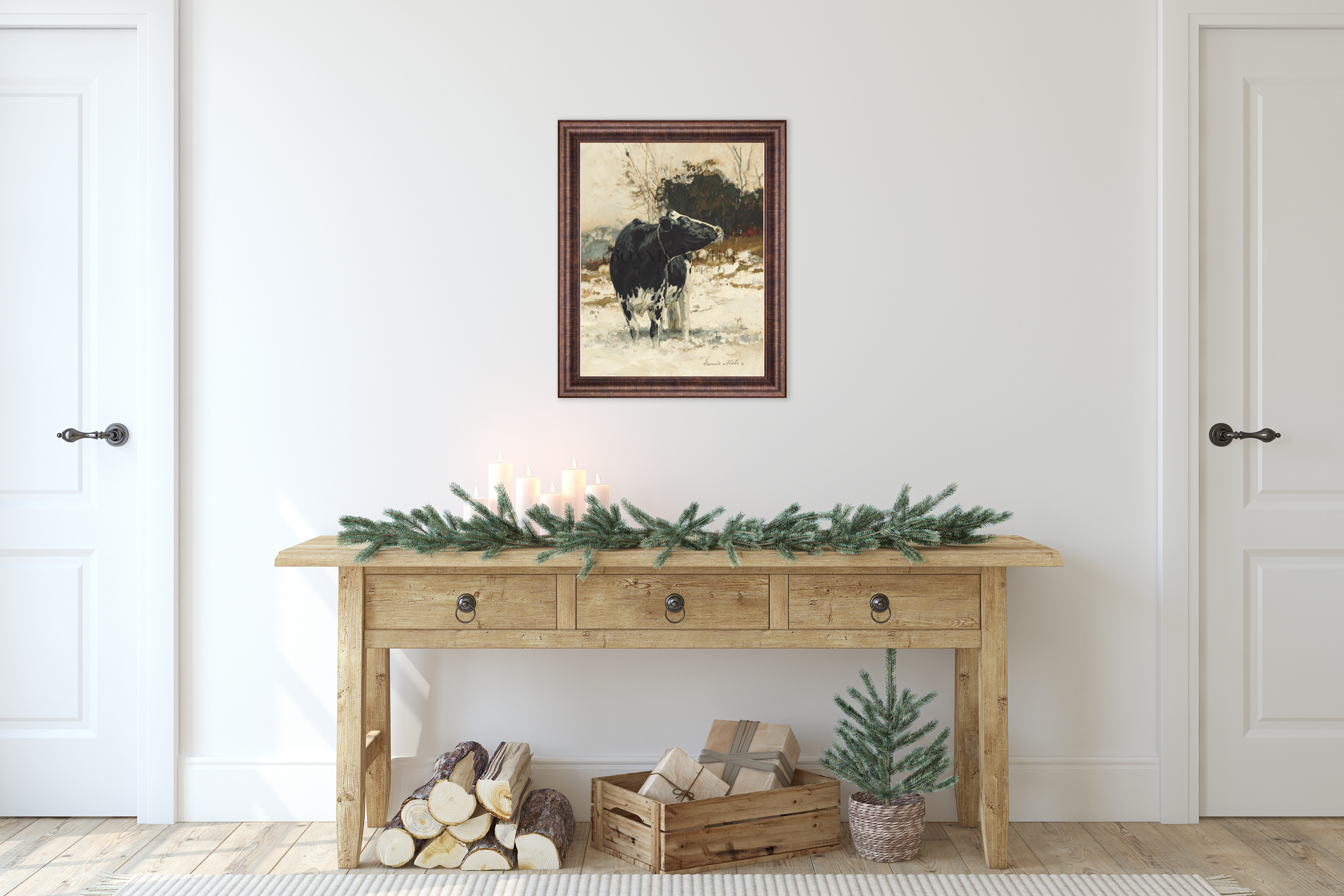 This image is also available in a card. Set against a peaceful winter setting, this beautiful Holstein cow...