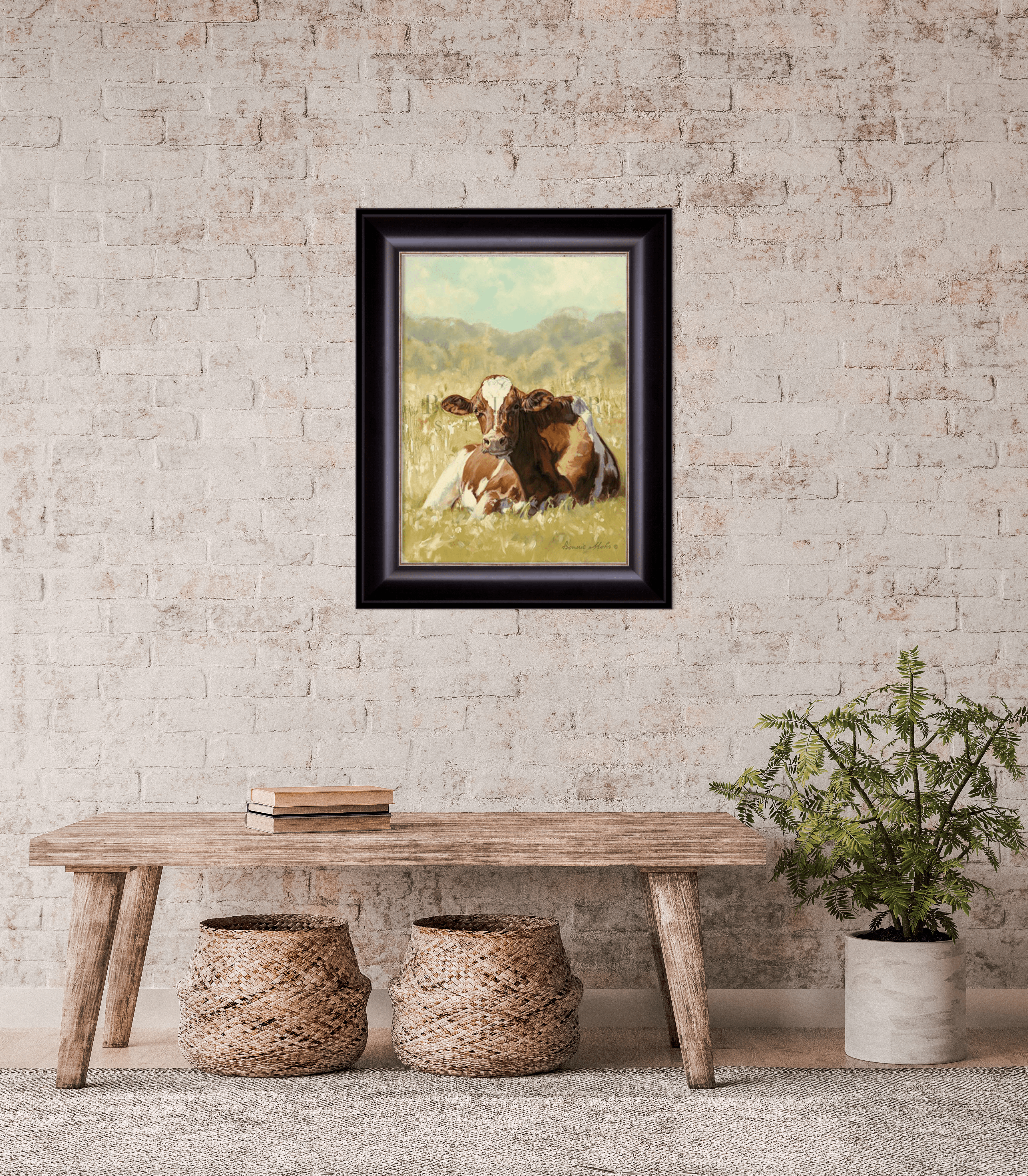 Golden Girl is a lovely print by artist Bonnie Mohr. This gorgeous Midwestern golden beef cow lends a striking elegance...