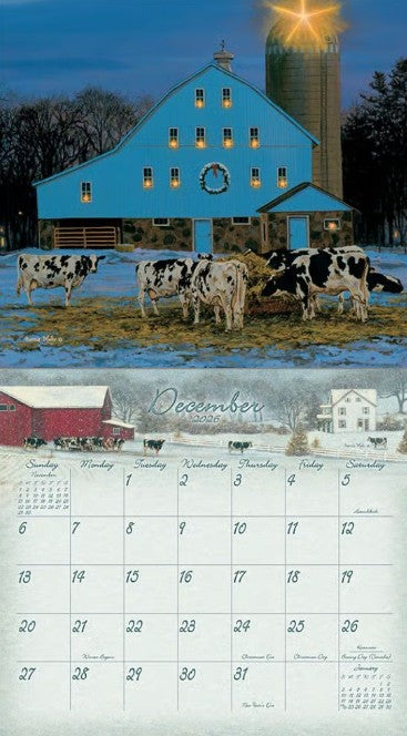 A gorgeous 12-month calendar featuring the sweet, sentimental rural-inspired artwork of artist Bonnie Mohr. This 13 3/8 x 12-inch calendar is printed in exquisite full color on high quality linen-embossed paper; grommet-reinforced drilled hole ensures tear-free hanging; open calendar measures 13 3/8 x 24 inches. Each unique calendar is presented in a special calendar sleeve that showcases the cover image on the front and each monthly image on the back. These Bonnie Mohr calendars make a perfect gift for every cow lover on your list!