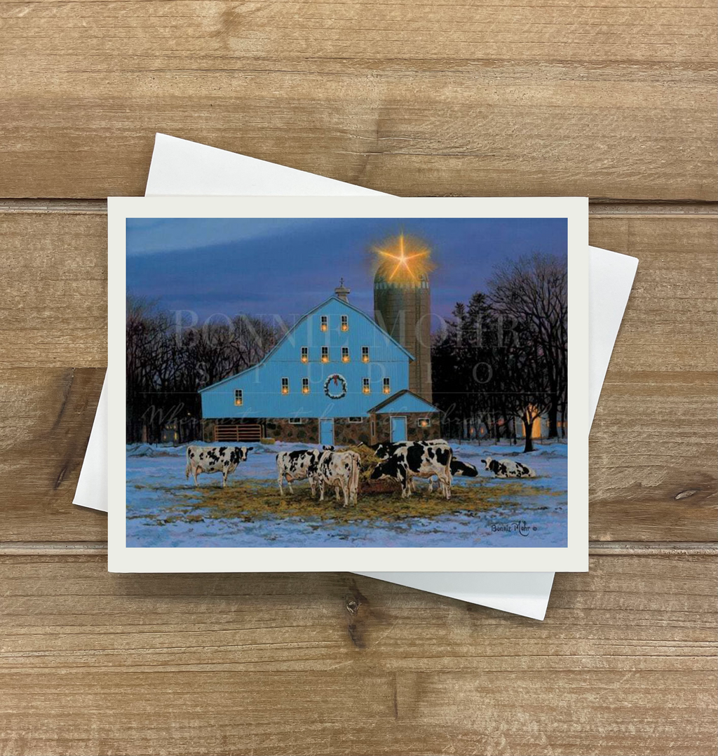 This charming winter landscape artwork by Bonnie Mohr, features a cheerfully lit white barn complete with a Christmas wreath and a large shining star on the top of the grain silo. The farmhouse is warmly lit in the distance, as the herd of Holstein cows gather in the farmyard after a light dusting of snow. View additional barn, winter, and Holstein artwork by Bonnie Mohr.