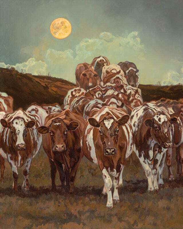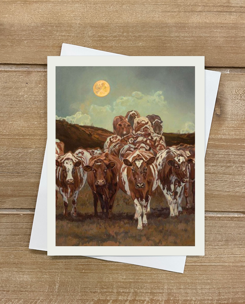 This artwork by Bonnie Mohr captures a group of Milking Shorthorn cows in a pasture in a dusk setting. The background is a dusk setting. View additional Milking Shorthorn cow and note card artwork by Bonnie Mohr.