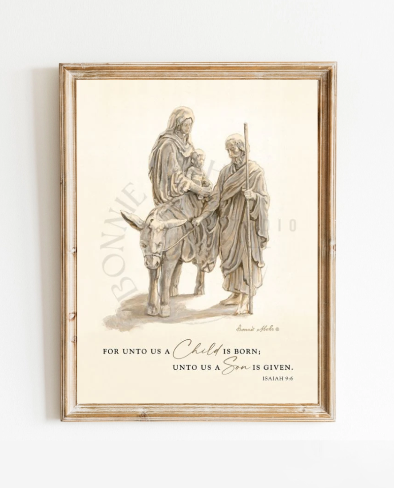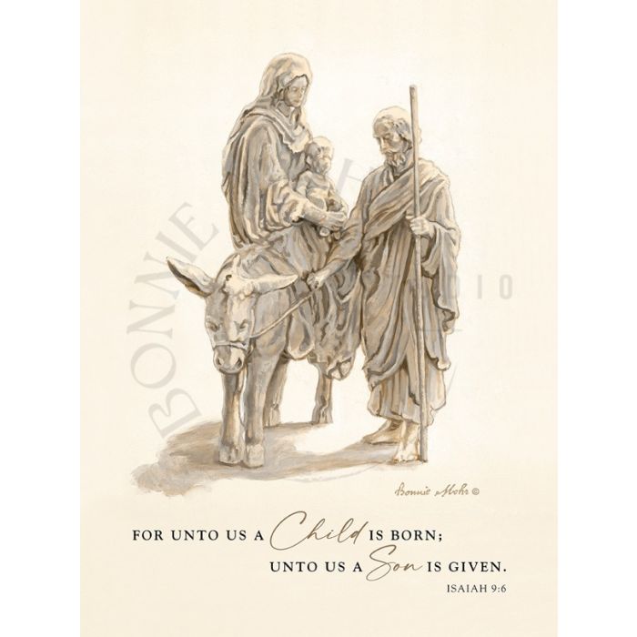One starry night, so long ago, in the little town of Bethlehem, the world was changed forever. Jesus Christ, our Lord and Savior came into this world in a small stable filled with the warmth of gentle animals and the love of his mom and dad. On that holy night, our blessed Lord came, that we might have eternal life and salvation. History celebrates the birth of Jesus every Christmas; it is the marker of time as well as the beloved season of joy and celebration. I loved doing this oil painting, inspired by this statue of Mary riding on the donkey holding baby Jesus while Joseph leads the way as they journey to Egypt. He was, is and will be Emmanuel forever and ever – I hope you will enjoy this painting as much as I do – and to be enjoyed all year long! Emmanuel comes in a card, paper print, and canvas giclee and may also be custom ordered in larger sizes.