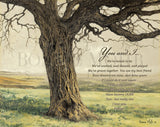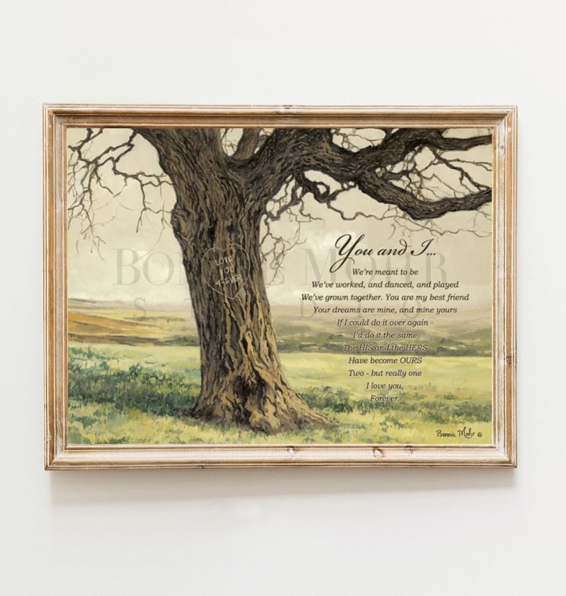 This big old oak tree is just down the road - or maybe in your own backyard - or maybe on a hilltop down a lost country road...and carved with love are sentiments of loved. With just a touch of romance, this is a perfect print to be shared with your loved one for a wedding or anniversary gift or just to tell someone you care about them. View additional inspirational and wedding artwork by Bonnie Mohr.