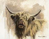 A message from Bonnie: “I love this painting, HIGHLAND, with it’s wild, strong, and untamed spirit. Matter of fact, I sometimes feel and look this way when I get out of bed in the morning!” This is a Highland cow and is a Scottish breed of rustic cattle. It’s long horns and shaggy coat are hardy traits to help them withstand the intemperate conditions of its homeland origination. Highlands have distinctive horns and long, wavy, woolly coats with a wide range of colors including red, ginger, black, dun, yellow, white, grey, tan, silver and brindle. Despite their long hairy bang, known as a ‘dossan’, they seem to navigate their way around just fine! Their gentle temperament makes them just as lovable as they are adorable. This HIGHLAND cow resides near my studio, at Tangletown Gardens, near Plato, MN!