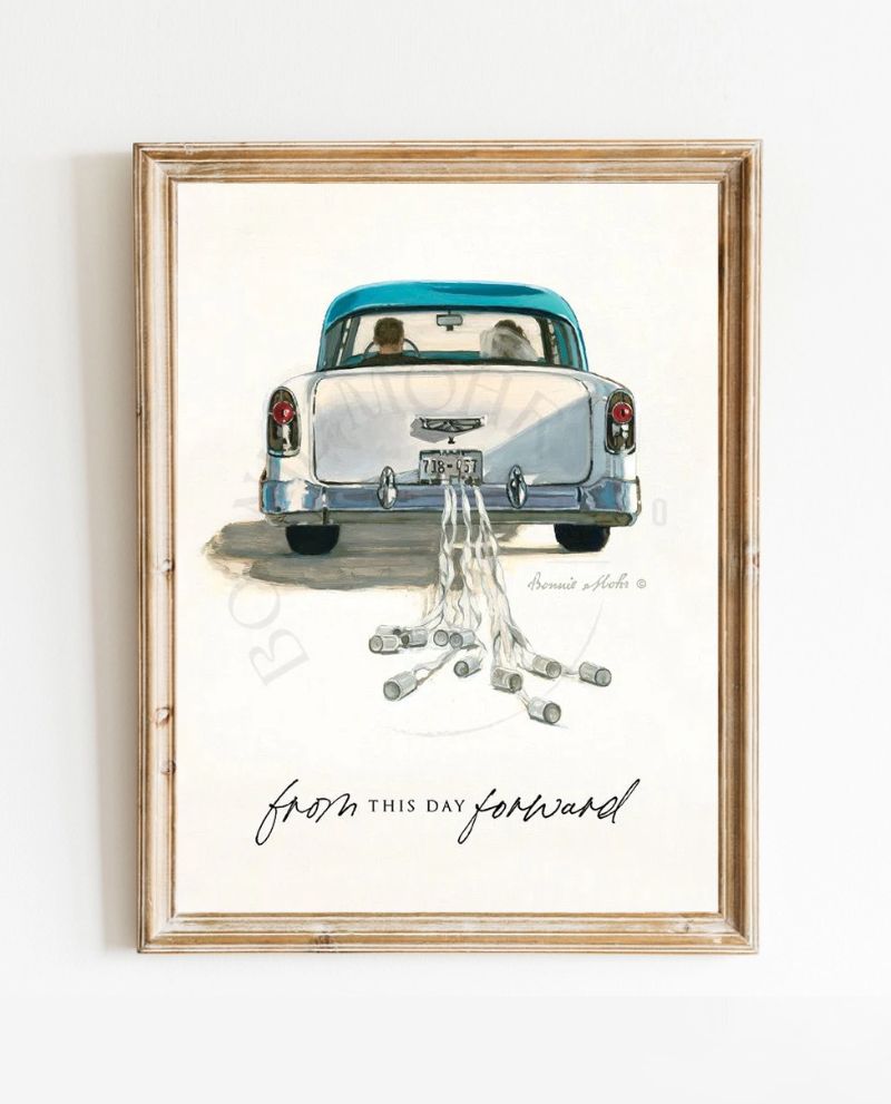 There is just something enchanting about vintage cars, especially when they have tin cans dragging behind! Even more magical is the newly married bride and groom riding inside them! In JUST MARRIED, I have painted a ‘dream come true’ message for every newlywed couple that ever was and ever will be married….to spend a lifetime together, filled with love and joy. The verse ‘from this day forward’ symbolizes the road ahead and the everyday commitment for this bride and groom, to share in this new life of being married together forever. Just Married comes in a card, paper print, and canvas giclee and may also be custom ordered in larger sizes.