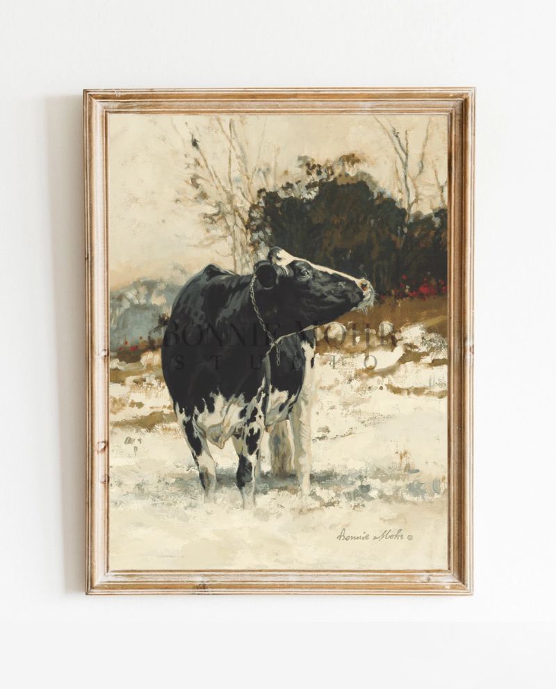 Set against a peaceful winter setting, this beautiful Holstein cow stands tall and alert. Did she hear her master calling her in for evening milking? Did she hear a nearby forest friend cry or call? Or is she just adorning the serenity and calm of a mid-winter afternoon? In SNOWBELL, bovine artist Bonnie Mohr captures the essence of the pure beauty and grace in the magnificent Holstein cow – a perfect piece to give the dairyman or cow lover in your life!