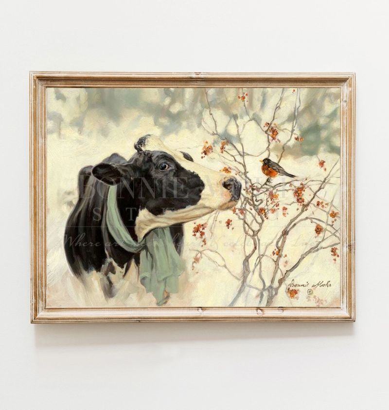 This lovely Holstein Cow finds friendship and fascination with a sweet winter robin who seems to be ‘out of season’ but is contently feeding on a backyard bittersweet vine! I love the giant but gentle feeling this dairy cow shares in an intimate moment between herself and her little robin friend. Bonnie Mohr Studio is pleased to share this touching image with you...a perfect Christmas Card, print or gallery wrap for the holidays, portraying the magic of the season and unexpected surprises. View more Christmas, Holstein, and dairy artwork by Bonnie Mohr.
