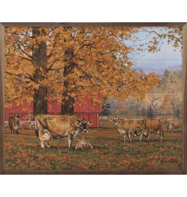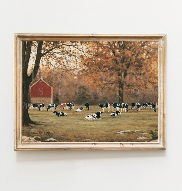 One of my earlier paintings, Under the Autumn Oaks continues to be a favorite. The ginger color of this fall foliage creates the perfect background to set off the quaint red barn and perfect herd of Holstein cows. If I were a cow, this place would be paradise!